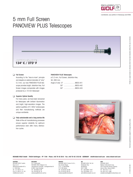 Full Screen According to the "less-is-more" principle and despite an external diameter of "only" 5.3 mm, our new PANOVIEW PLUS telescope provides bright, distortion-free, Full Screen images comparable with images produced by a 10 mm telescope! R Superior Optical Quality For many years, we have been renowned for telescopes with brilliant illumination and bright, high-resolution images. The optical qualities of R. WOLF endoscopes and their manufacturing methods are unique worldwide. R Fully autoclavable and a long service life State-of-the-art manufacturing processes ensure superior reliability for optimum performance even after many sterilization cycles.
